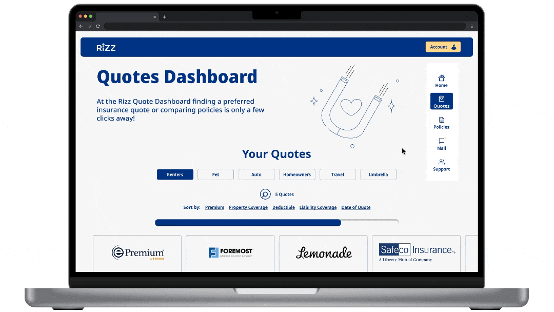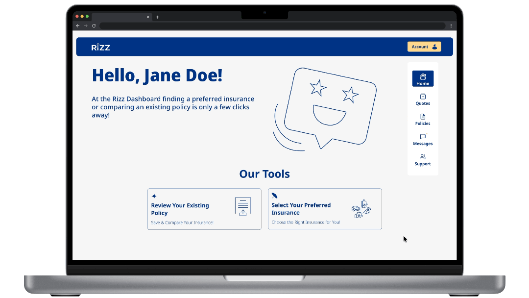 Property and Casualty (P&C) insurance is often synonymous with jargon-heavy forms, legacy workflows, and a trust gap with younger buyers. Rizz set out to rethink how P&C insurance could be bundled, quoted, and bound in a seamless, digital-first experience. How might we create a quoting experience that earns trust, reduces friction, and makes insurance feel less like homework?